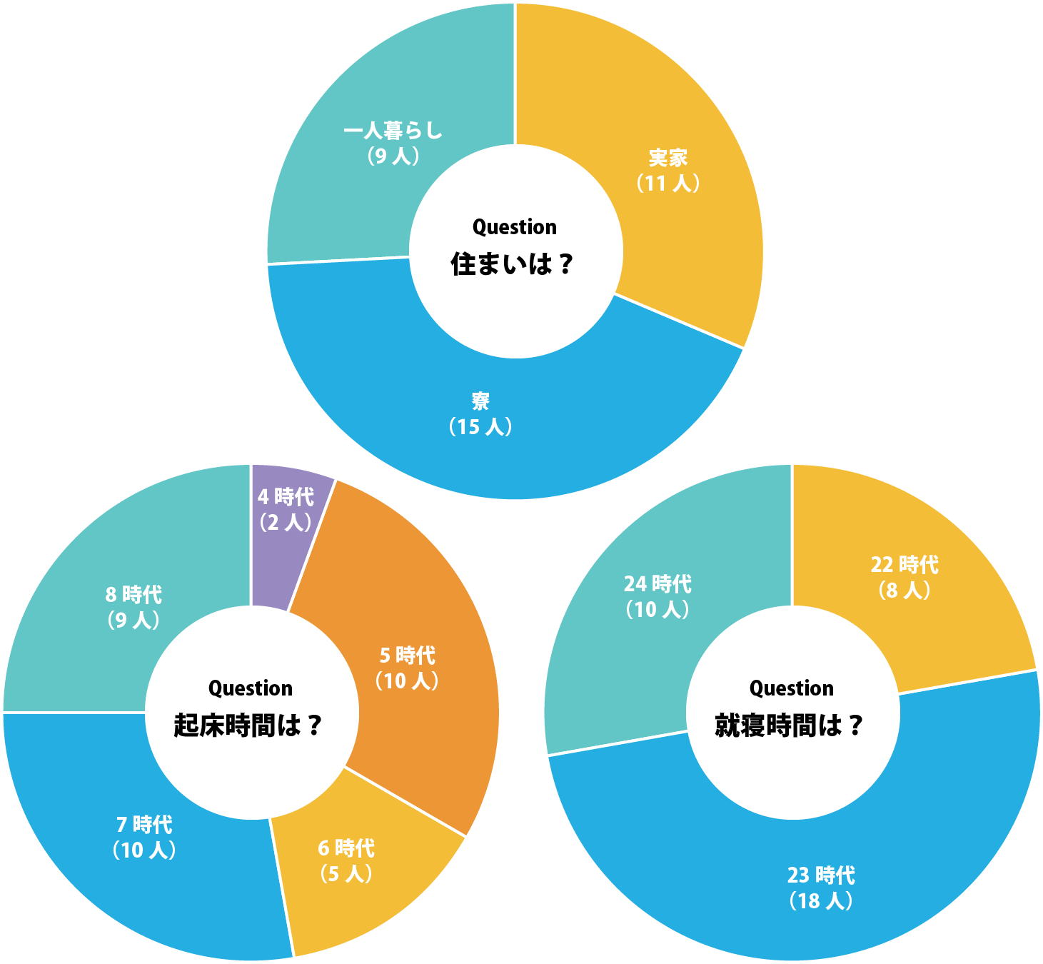 起床時間を見てみると、3分の1の選手が4~5時代に起きているという結果に。朝練を行っている大学の選手は当然ながら起床時間も早めでした。また、就寝時間に関しては、みなさん日付が変わる前には寝ているという結果に!朝が早い場合でも、8時間程度はしっかり睡眠時間を確保しているようです。さすが!