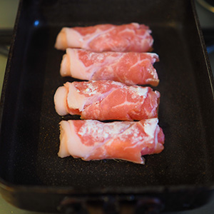 1. フライパンにサラダ油を入れ中火にし、巻き終わりから焼き、全体に火を通す。