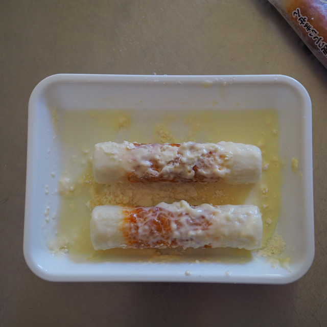 竹輪の磯辺揚げは磯辺焼きにします。かなり少ない油でじっくり全面焼くだけですが、ちゃんと天ぷらになります。衣も適当で全然大丈夫です。