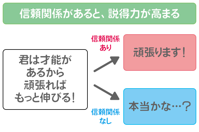 例えば、自分のことを全然知らない人から「君は才能があるから頑張ればもっと伸びる」と言われても、根拠がないので全然響きませんよね。でも、信頼関係がある人から言われたときは、「頑張ろう」という気持ちが湧いてくると思います。