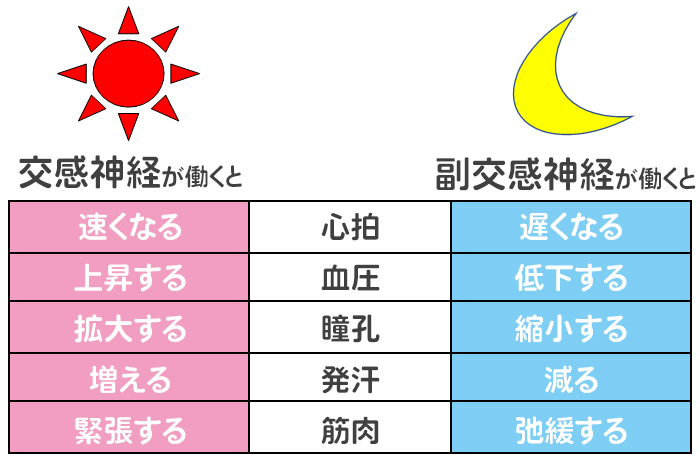 自律神経には、「交感神経」と「副交感神経」の2種類があります。この2つがバランスをとりながら心臓や腸、胃、血管などの臓器の働きを司っていて、健康に欠かせないものです。こんな風に教科書に書かれている通りに言われても、ピンとこない方も多いかなと思うので、下の表を参考に具体的な事例をご紹介します。