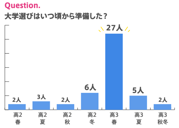 大学進学を決めた選手たちは、当時いつ頃から進路を意識していたのでしょうか? 今回、大学選びの準備をいつ頃から始めたか、また、何校検討したかを聞いています。まずは、いつ頃から準備したか?の結果を見てみましょう。