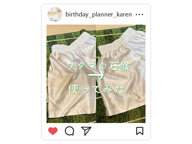 「うちに常備しているウタマロ石けん。正直家事はあんまり得意じゃないけど、私はウタマロさえあれば大体のことは解決できる!ウタマロ石けんでサクッと洗って洗濯機に入れるだけで、白いウェアや靴下がまっ白に」