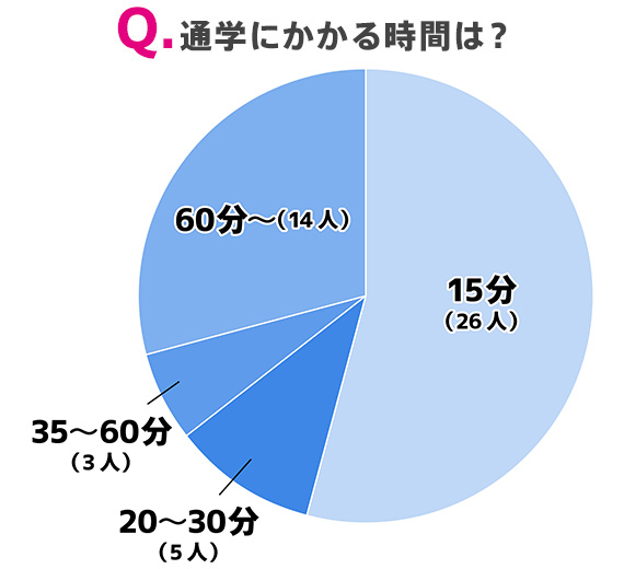 また、通学時間を見てみると、約半数の26人が15分以下という結果に。ちなみにこの26人のうち、実家暮らしは1人のみ。やはり寮や一人暮らしの方が通学時間はかからない傾向があるようです。