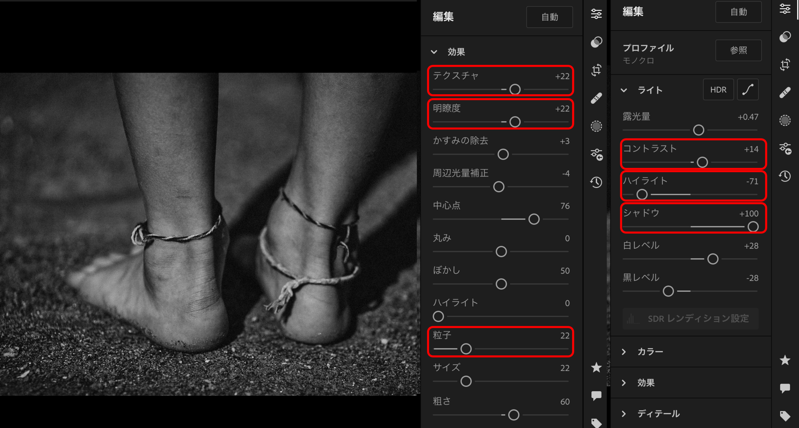 言葉で書くと分かりにくいと思いますので、私が使っているLightroomのモノクロレシピを公開します。同じ数値に設定して暗い場合は露出をプラスに、明るすぎる場合は露出をマイナスにするなどして、ご自身の写真とお好みにあわせて調整してみてください。