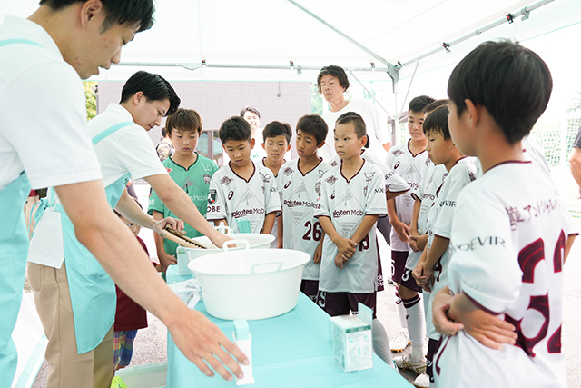 ウタマロスタッフが、お洗濯のコツを踏まえながらウタマロ石けんの使い方を実演。泥だらけの靴下が見る見るきれいに落ちる様子に選手たちからは「すごい!」「まっ白!」といった驚きの声が上がりました。