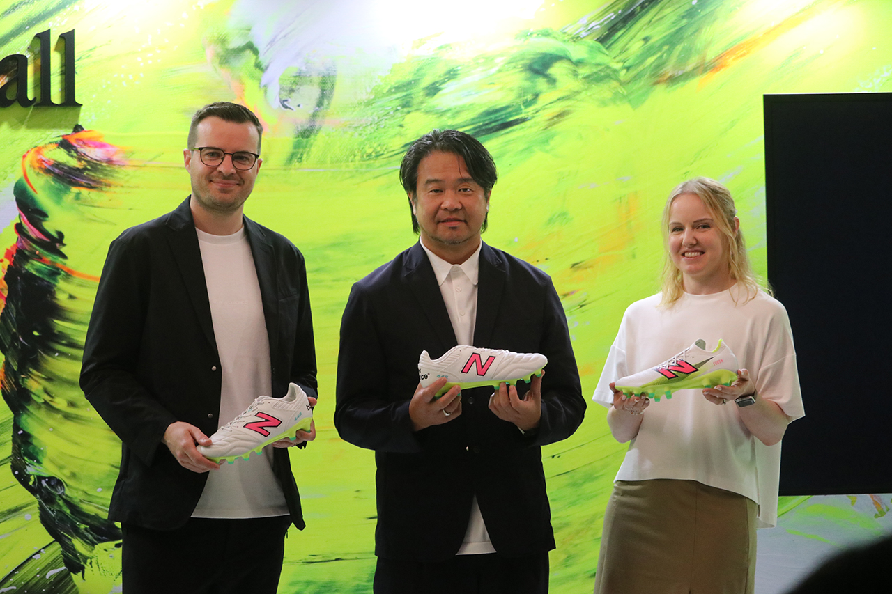 会見の後半にはニューバランスジャパンの久保田伸一社長が登壇。2015年のサッカー界参入から現在地を振り返り、「日本のフィードバックをもとにグローバルチームと一緒に作った442が、プレーヤーのニーズに応える商品として順調に売り上げを伸ばし、やっと支持を得られるようになってきた。アパレルに関しては全国数多くのチームウェアを展開するに至り、マーケティングに関しては裏選手権(ニューバランスカップ)も回数を重ね、ヤングアスリートからの信頼も得て、ブランドポジションが上がってきている」と自信をのぞかせた。さらに「新規契約選手へのアプローチもいろいろな形で進めております。今後もフットボール界のトップブランドと肩を並べるポジションになっていきたい」と飛躍を誓った。