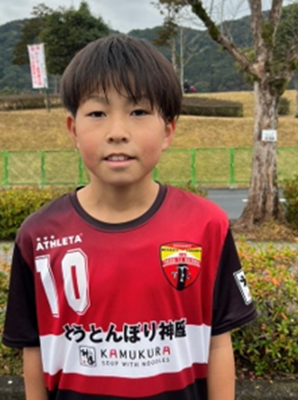 「チームとして勝ち切るということを目標にしてきたので、全国大会に出ることができてとても嬉しいです。ネイマール選手(ブラジル代表、アル・ヒラル所属)が憧れなのですが、同じ左サイドやトップ下として、ドリブルやシュートでのチャンスメイクでチームに貢献できるプレーが得意です。これまで家族みんなで試合の応援をしてくれていて、今回の大会にも来てくれました。家族の期待に応えられるように精一杯これからも努力して、夢であるプロサッカー選手になりたいです!」