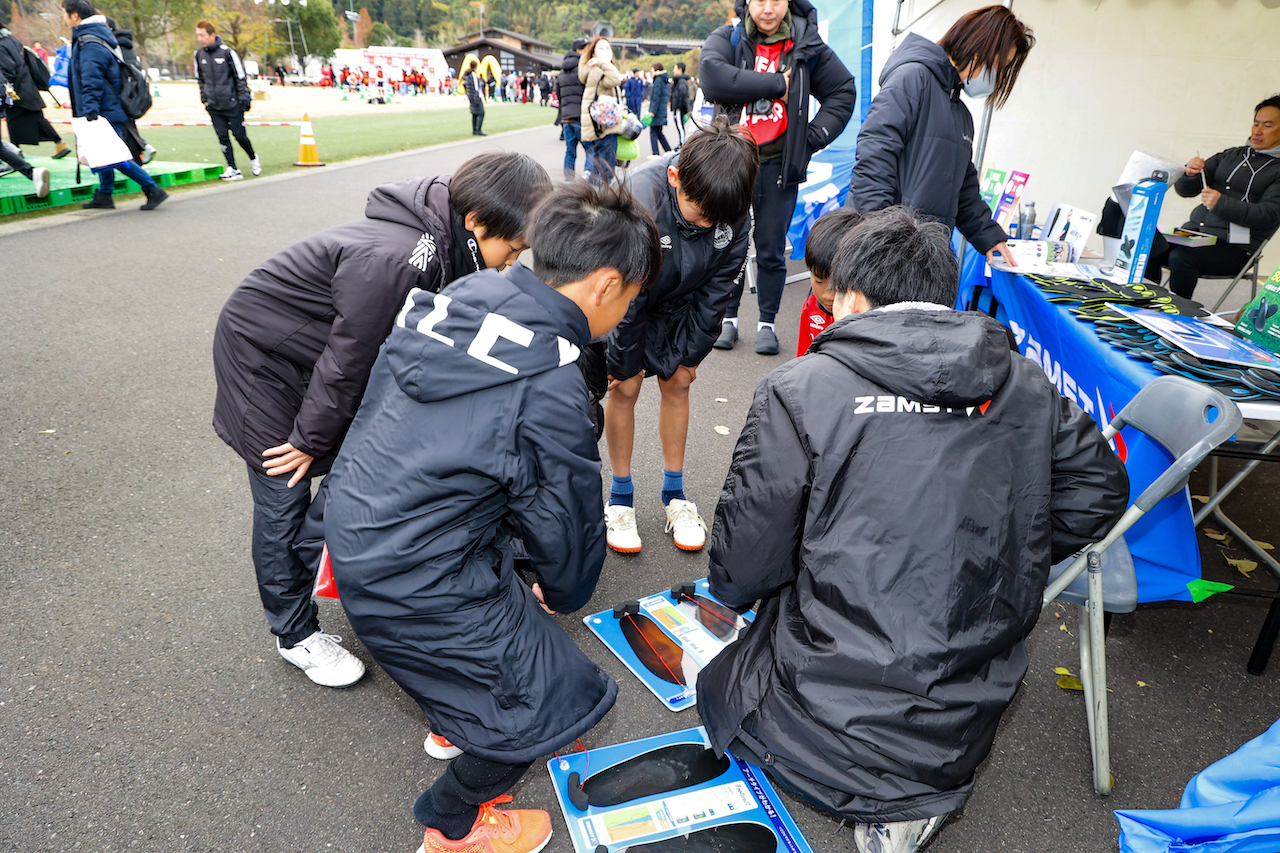 ブースには大会に参加したチームの選手や地元の子どもたち、保護者が多く訪れ、自分の足型を測り、インソールを試すと驚きの声が上がりました。測定を担当したザムストのスタッフに話を聞くと、「全国大会に出場する選手の親御さんということで、コンディショニングギアに対する意識が高く、サッカー専用のインソールについて知っている方が多くいらっしゃいました」と感心した様子。普段から身体のケアやコンディニングを意識して取り組んでいるからこそ、全国大会に出場するような選手に成長したのかもしれません。