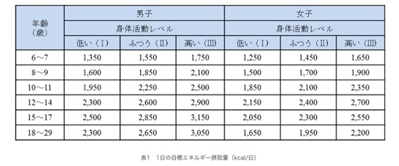 必要カロリーを算出する公式は【子どもの体重】×【基礎代謝基準値】×【活動レベル】で算出できるそうです。また、JFAの公式サイトにも年齢に応じた必要摂取エネルギー量が掲載されているので、参考までに載せておきます。